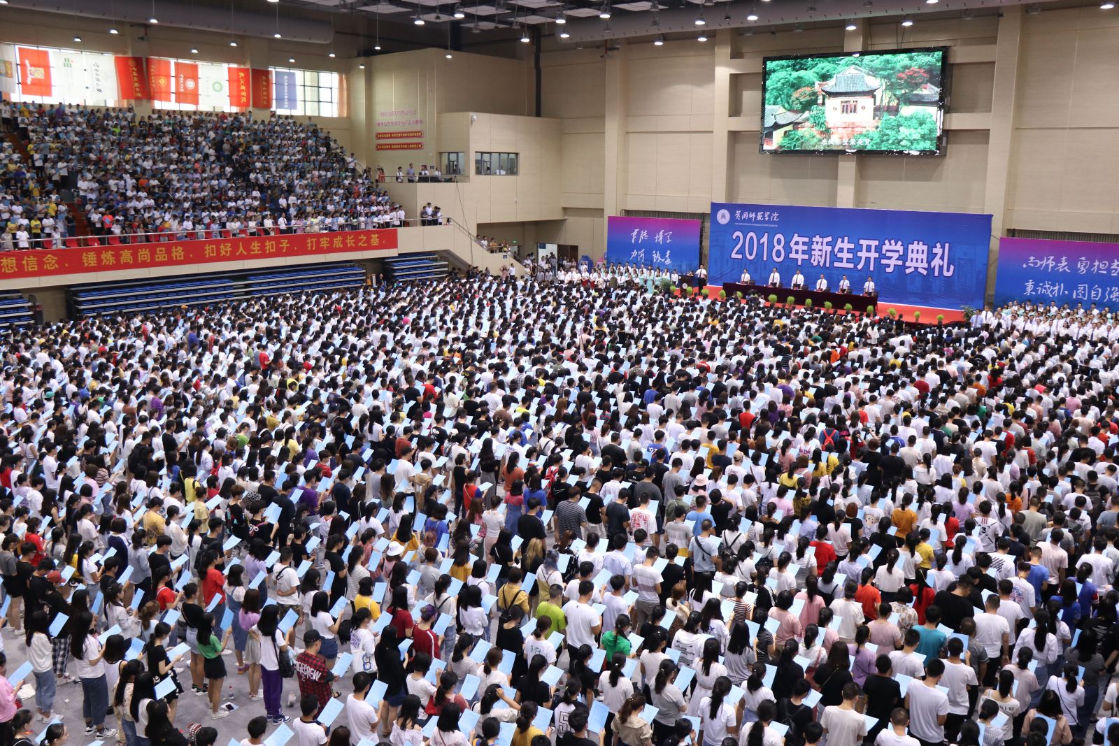 开学典礼首次在新落成的体育运动中心举行。整个仪式隆重而简朴,场面宏大而壮观。场内人头攒动,不断切换的现场直播画面,记录了一个个生动的瞬间。新生们的脸上写满喜悦、期待,他们聆听着师长的谆谆教诲,佩戴上崭新的校徽,吟唱着铿锵有力的黄师校歌,确认过眼神,他们成为黄师的新主人,他们将勤读不辍,追求卓越,用智慧和汗水谱写青春最美丽的华章!