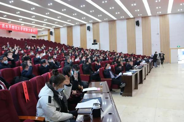陈向军作了题为《迈步新阶段聚焦新目标开启新征程奋力谱写“全省一流、全国知名”高水平师范大学建设的崭新篇章》的学校工作报告。他指出,2020年,是极不平凡的一年。面对申硕决胜、新冠肺炎疫情、防汛救灾三重大考,全校上下迎难而上、砥砺奋进,统筹疫情防控和学校事业发展,推进“十三五”规划圆满收官,申硕工作取得重大进展,疫情防控取得重大战果,防汛救灾取得重大胜利,教育脱贫攻坚取得重大成就。2020年,全校师生共同努力完成了各项工作,取得骄人成绩。一是保持工作定力,申硕决胜成功突围;二是积极妥善应对,三大战役全面胜利;三是把好三大关口,人才培养更具活力;四是坚持第一资源,师资结构持续优化;五是统筹内外兼修,学科建设与研究生工作稳步推进;六是聚力创新发展,科研水平持续提升;七是推进开放办学,对外交流不断深化;八是持续深化改革,治理水平不断提升;九是突出以民为本,师生满意度不断增强; 十是聚焦强基固本,党的领导坚强有力。他强调,要准确把握新形势新要求,加速推进内涵建设。要科学研判“时”与“势”,辩证把握“危”与“机”,充分估计困难,更要坚定信心,百折不挠,准确识变、科学应变、主动求变,抢时间、抢机遇、抢要素,努力在危机中育先机、于变局中开新局,奋力谱写“全省一流、全国知名”高水平师范大学建设的崭新篇章。