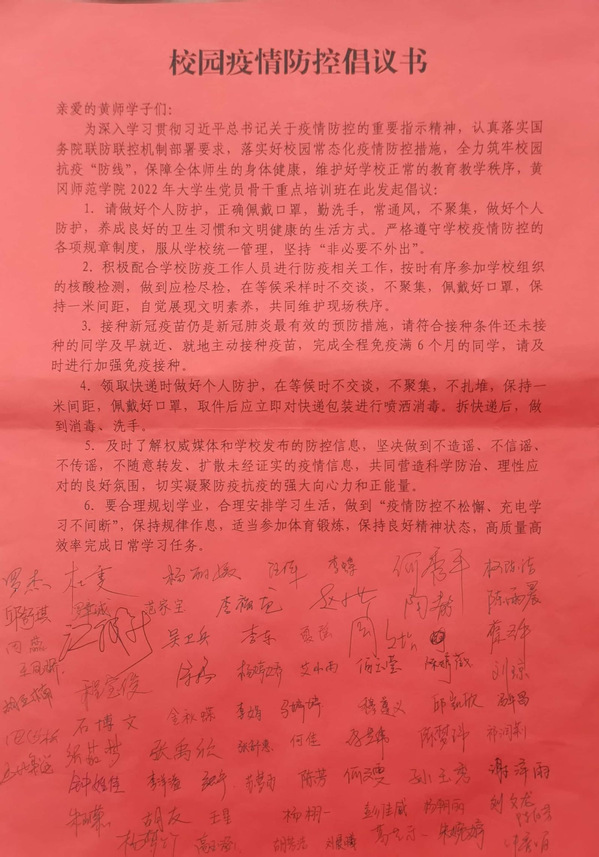 为加强常态化疫情防控期间对大学生的思想政治教育与价值引领,进一步激发广大党员在学校和黄州区疫情防控、核酸检测工作中发挥先锋模范作用,10月7日下午,校党委书记陈向军以《弘扬伟大抗疫精神 争当疫情防控“四员”》为题,在厚德楼学术交流中心为学校2022年大学生党员骨干重点培训班讲授疫情防控思政课,校党委副书记王基家主持。陈向军从“怎么看”“怎么想”“怎么做”三个方面入手,深入分析了当前国内外严峻复杂的疫情形势,以及学校党委为确保师生安全采取的一系列具体措施,要求同学们深刻认识违反疫情防控规定的危险性,告诫同学们不能心存侥幸,要严格遵守疫情防控规定,共同守护我们的校园。