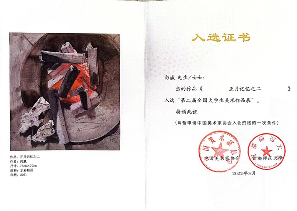 本网讯 日前,由中国美术家协会主办的“第二届全国大学生美术作品展”评选结果揭晓,我校美术学院涂远芳教师指导的由向瀛同学创作的《正月的记忆之二》获最高奖(具备申请中国美术家协会入会资格),并在中国美术馆展出。