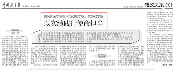 11月20日,《中国教育报》以《以实绩践行使命担当》为题,从“弦歌不辍,奋进不止”“坚守特色,坚持改革”两个方面,报道了我校音乐与戏剧学院、黄梅戏学院扎根大别山“红色土地”,全面推进教学、科研、艺术实践发展新路的经验作法。