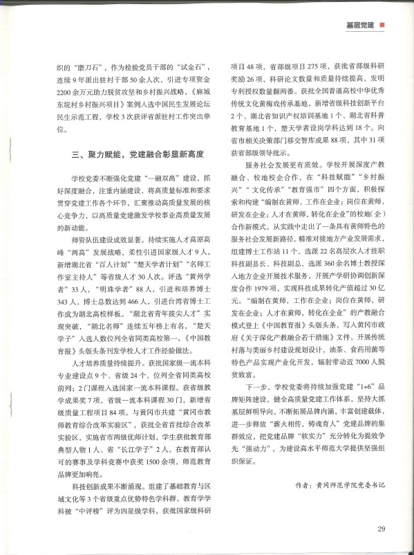 本网讯 “七一”前夕,中共湖北省委组织部、中共湖北省委党的建设工作领导小组办公室主办的《湖北党建》(2023年第3期)刊发校党委书记陈向军署名文章《立足“一融双高”党建引领构建多领域党建体系,以高质量党建引领高水平师范大学建设》。文章从“举旗定向,党建引领绘就学校事业发展新篇章”“培根铸魂,党建工作焕发新活力”“聚力赋能,党建融合彰显新高度”等三个方面,回顾总结我校开展党建工作的经验做法,全面展示我校党建工作新成效,以高质量党建推动学校事业高质量发展,以更高质量的美好黄师建设成效,为强国建设、民族复兴伟业贡献新的更大力量!