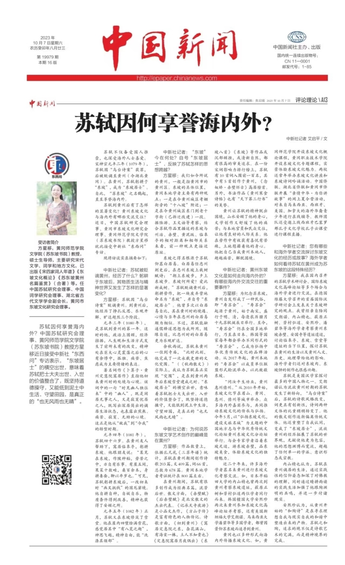 10月7日,《中国新闻》A13版(评论理论)以《苏轼因何享誉海内外?》为题刊发了中新社记者专访我校文学院(苏东坡书院)教授方星移的文章。文章从苏轼被贬谪黄州之后的物质生活与精神世界、在黄州期间的文学艺术创作、黄州东坡文化与海内外的交流交往等方面分析了她对苏轼在黄州这段特殊经历的独到看法。此前,中国新闻社公众号、中国新闻网、中国新闻社学习强国号等媒体平台也先后刊发了这一采访文章。