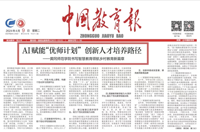 《中国教育报》2024年4月9日第07版(教育展台)以《AI赋能“优师计划” 创新人才培养路径——黄冈师范学院书写智慧教育领航乡村教育新篇章》为题,从“开发AI线上课程,构建个性化学习资源平台”“打造智慧书写中心,实现个性化书写技能训练”“建立智慧口语评测平台,助力个性化语言能力训练”“搭建教师教学能力AI测评平台,强化个性化教学技能训练”“创新举措成效显著,擦亮教师教育品牌”五个方面报道了我校扎实推进高等教育数字化战略行动,利用人工智能技术,通过建设智慧教室、智慧课程、智慧书写中心与智慧口语评测平台及升级教师教育技能训练中心等创新举措,大力提升“优师计划”人才培养质量。