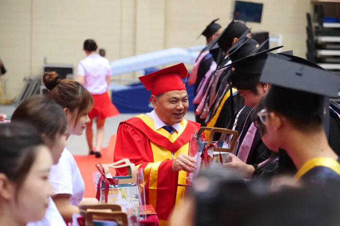 音乐声中,校领导和教师代表为毕业生授予学位,行“拨穗礼”。