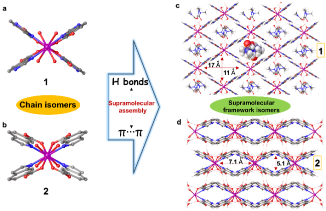 金属氢键有机框架材料(MetaloHydrogen-bonded organic frameworks, MHOFs)是一类新兴的多孔超分子框架材料,由含有金属的次级结构单元和有机配体通过氢键作用自主装构成,在质子超导、气体分离、荧光传感、分子磁性等领域具有广泛的应用前景。由于其具有较高的比表面积、多孔性、低密度和结构可调控等优势,兼备了金属有机骨架(MOFs)和共价有机骨架(COFs)两类多孔晶体材料的优点,近年来已引起世界各地科学家们的广泛关注。黄冈师范学院邵东博士团队通过设计合成一种一维钴链,通过超分子弱作用和超分子异构现象,构筑了两种孔隙性、磁性、稳定性不同的超分子异构体MHOFs。这些发现不仅表明MHOF材料的结构和稳定性、孔隙度和磁性可以通过超分子异构化方法进行有效调节,还为磁性调控研究领城提供了新的方向和思路。
