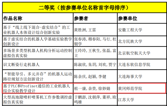 自大赛启动以来,参赛教师团队积极筹备,围绕《工业机器人系统集成》课程总结实验教学经验,精心准备参赛作品。在决赛中,参赛团队以“基于PLC和Profinet通信的工业机器人综合实验教学设计”为主题进行答辩,从实验目的、实验设计思路、实验执行情况、实验创新点、实验成效等5个方面进行阐述,并回答专家提问,充分展示了我校教师对实验教学内容研究探索和创新改革的成效,经过激烈角逐,最终获得全国二等奖。