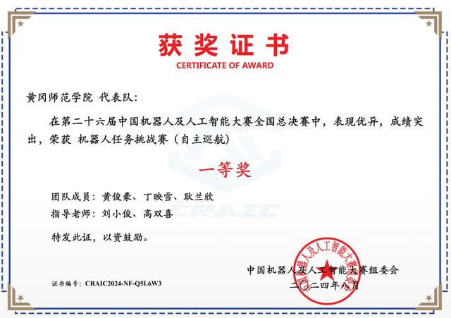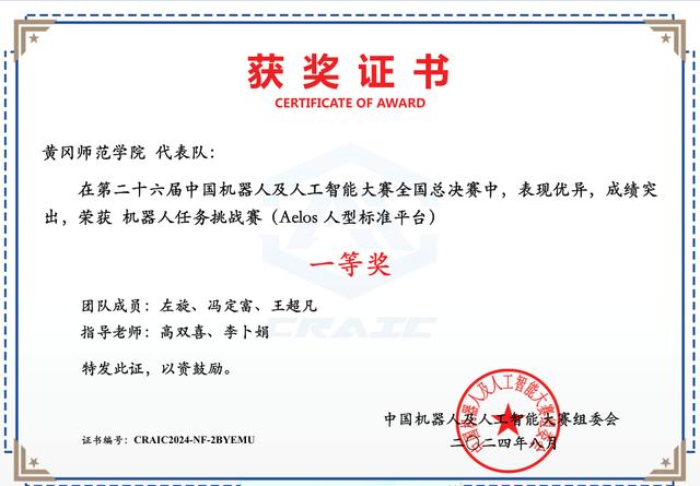 近年来,黄冈师范学院机电与智能制造学院大力开展“以赛促学,以赛促教”活动,取得丰硕成果,已经连续两年在机器人与人工智能大赛国赛上斩获一等奖。此前,在杭州举行的2024睿抗机器人开发者大赛全国总决赛中,机电与智能制造学院派出的由电气2202班陶雨婷、李梅、宋昌杨组成的机智一队获得CAIR夺宝联盟赛项全国二等奖。