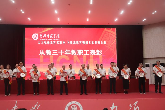 校党委副书记陈朝阳宣读2024年从教三十年教职工表彰名单,校党委副书记王基家宣读有关表彰文件。全体校领导为受表彰人员颁发荣誉证书及纪念品。