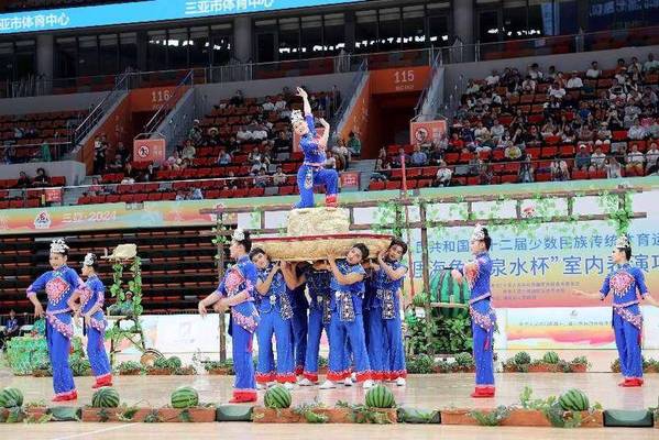 11月30日,第十二届全国少数民族传统体育运动会在海南省三亚市闭幕,这是我国规格最高、规模最大的全国综合性民族体育盛会。来自全国170支队伍参加比赛。由黄冈师范学院组织选送的表演项目技巧类比赛《顶瓜瓜》以两轮总分17.53分的成绩喜获一等奖,并被国家民委选定在11月29日举行的颁奖典礼中做大型展演。