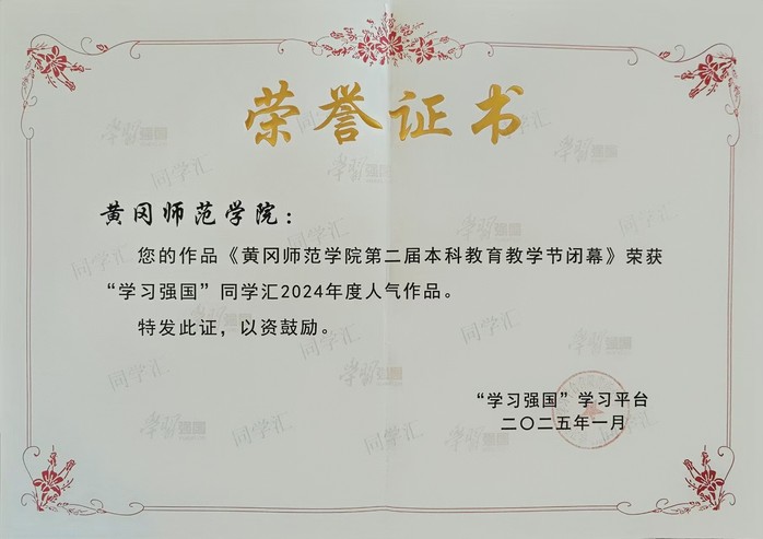 本网讯 近日,中宣部宣传舆情研究中心、“学习强国”学习平台公布了2024年度同学汇表彰结果,我校荣获“最具传播力高校”荣誉称号,全国共有52所高校获此殊荣,新闻作品《黄冈师范学院第二届本科教育教学节闭幕》获评2024年度人气作品(高校)Top100,党委宣传部王瑞娟和新媒体中心学生记者陆昭宇的2件作品获评2024年度人气作品(个人)Top100,黄冈师范学院新媒体中心获评2024年度高校融媒团队Top50。