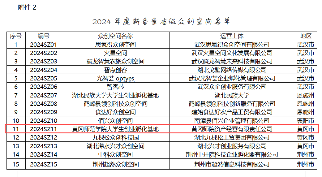 本网讯 近日,湖北省科学技术厅发布《关于公布2024年度新认定省级科技企业孵化器和新备案省级众创空间的通知》,我校大学生创业孵化基地成功获批2024年度“省级众创空间”,这是我校继2022年第三次获批“湖北省大学生创业示范基地”后,在创新创业平台建设领域取得的又一重要收获。