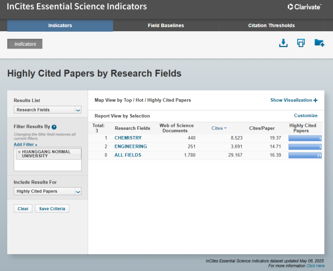 本期ESI数据统计时间跨度为2015年3月1日至2025年4月30日,黄冈师范学院工程学科共有ESI论文251篇,总被引3691次,篇均被引14.71次。