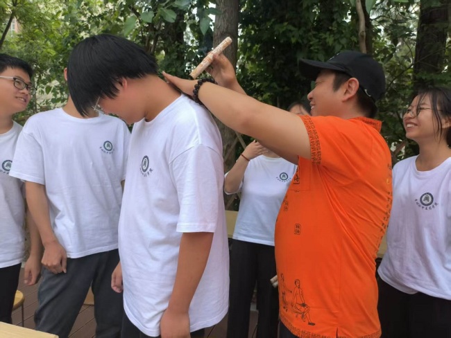 在“时珍中医小院”的后院,一位指导老师正在认真指导李时珍中医药学院的学生制作艾条。同学们热情高涨,在老师的指导下一丝不苟地操作机器,将艾绒放入机器内卷制成艾条。当看到自己亲手制作的艾条时,学生们脸上都难掩喜悦。指导老师还现场演示了艾条的使用方法:在艾条一端点火,待冒烟后,可用来熏蒸身体疼痛部位。同学们纷纷表示,要将自己亲手制作的艾条带回家赠予亲人。