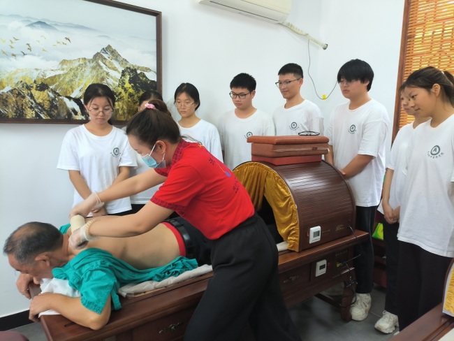 此外,时珍中医小院的老师们在调理间内还指导学生们进行洪光药推。现场同学们仔细观察、认真学习。这种“学中做、做中学”的产学研一体化模式,将理论知识与实践操作紧密结合,有助于培养“懂理论、精技能、有情怀”的中医药专业人才。