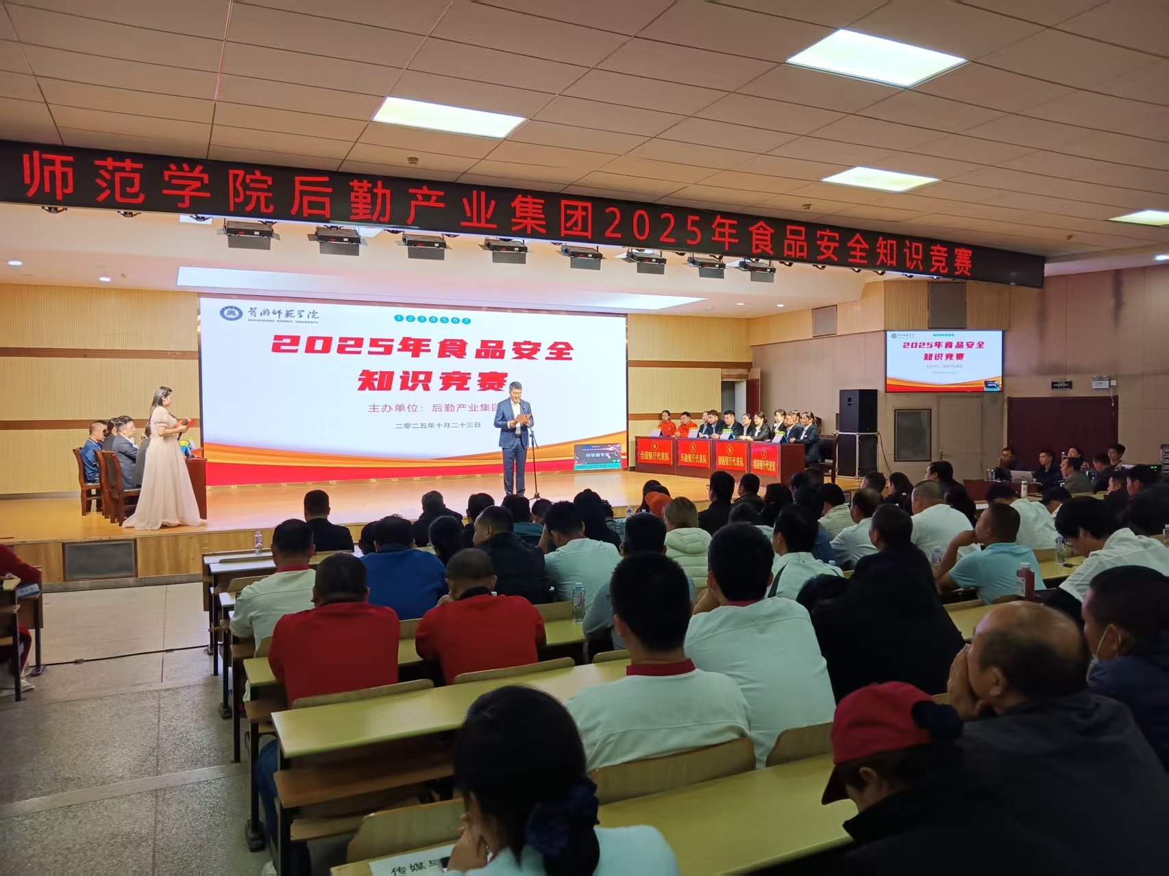 本次竞赛由黄冈师范学院后勤产业集团主办,学校合园餐厅、乐融餐厅、紫园餐厅、书香餐厅、教工餐厅等共7个餐厅代表队各派出3人参赛。竞赛内容有必答题和抢答题两个环节,其中必答题包括单选题和是非题,抢答题包括多选题和问答题。