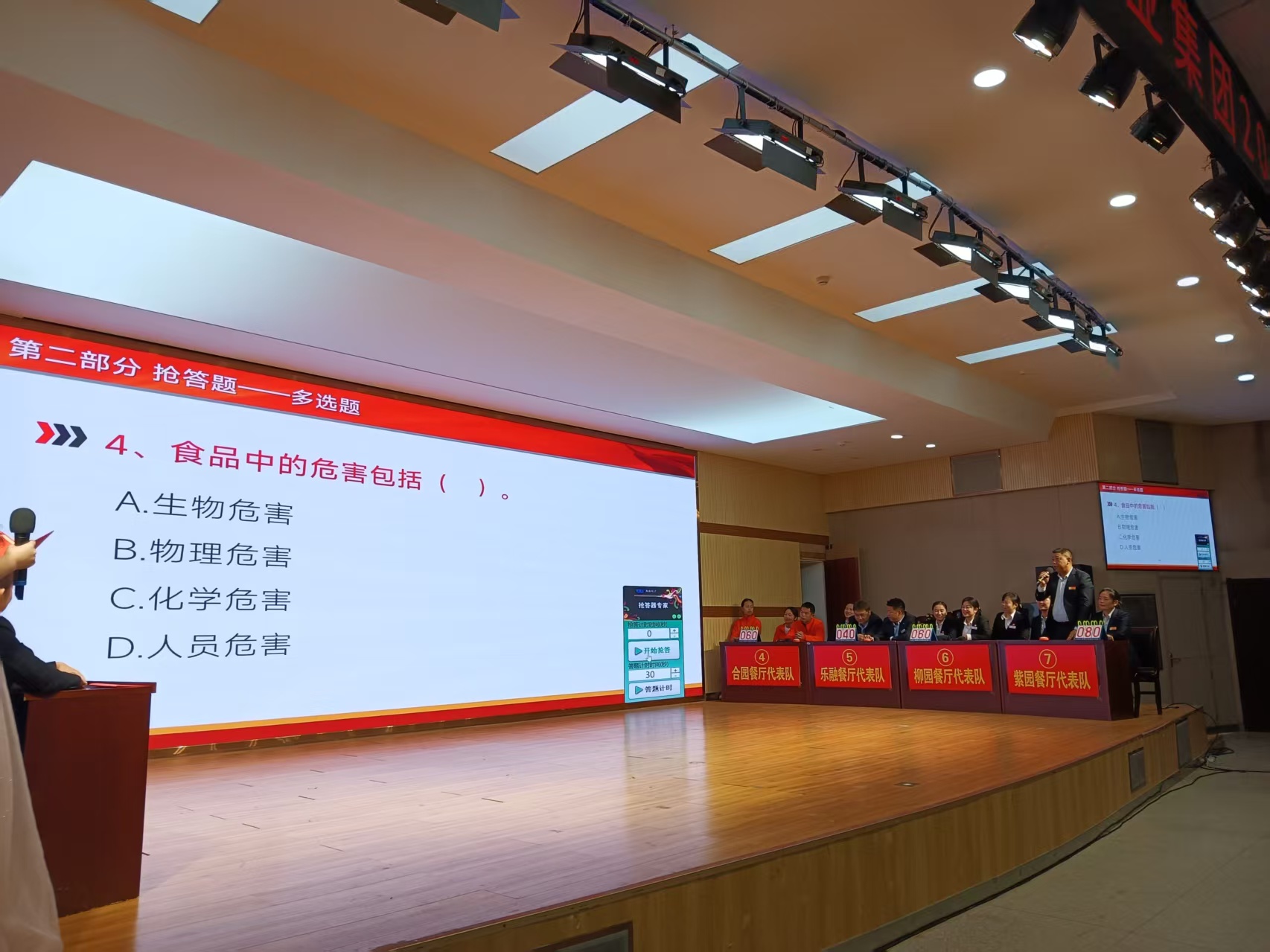 各队选手沉着应答,展现出扎实的知识储备,高正确率赢得台下阵阵掌声。抢答环节将气氛推向高潮,选手们争相按下抢答器的画面与声响引来笑声不断。其中,紫园餐厅代表队表现尤为突出,凭借快速反应与准确作答屡屡得分,最终荣获一等奖;书香餐厅、教工餐厅获二等奖;樟园、柳园、合园、乐融餐厅获三等奖。