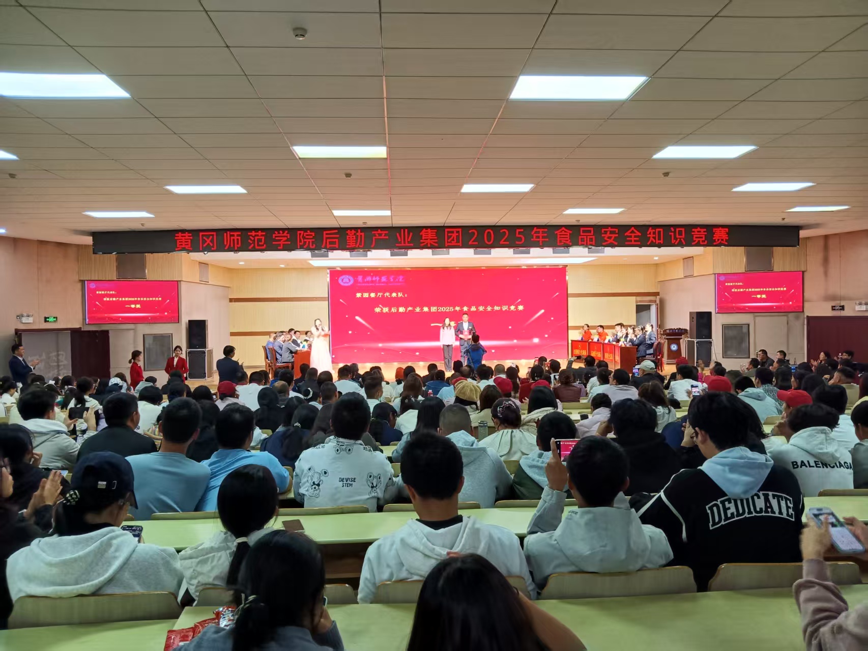 “世界公认的食品中三大致癌物质是什么?请抢答!”10月23日晚,一场激烈的食品安全知识竞赛在黄冈师范学院举行,学校7个餐厅代表队台上比拼,500余名学生台下观战。
