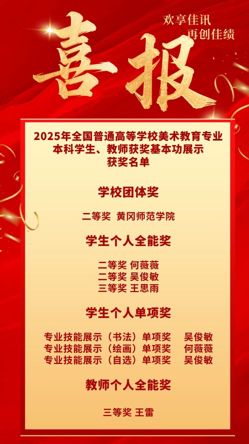 本网讯 近日,教育部公布了2025年全国普通高等学校音乐教育专业、美术教育专业本科学生和教师基本功展示评选结果,我校获团体奖二等奖1项。学生获个人全能二等奖2项、三等奖1项,个人单项奖3项;教师王雷获个人全能奖三等奖。