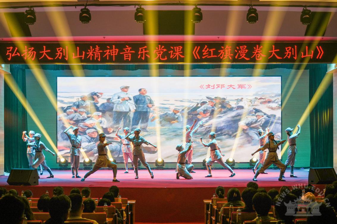 音乐党课以“红旗漫卷大别山”为主题,共分“先驱播火,唤起工农跟党走”“不胜不休,苏区红军勇战斗”“孤悬敌后,抗日劲旅歼倭寇”“勇当前锋,千里跃进利剑飕”四个篇章,以音乐为纽带、历史为根基,通过《董必武回黄安》《八月桂花遍地开》《三大纪律八项注意》等九首经典歌曲串联1921年至1949年大别山地区新民主主义革命历程。音乐党课融合理论讲解、歌舞表演、现场问答等多种形式,引导观众沉浸式感受大别山波澜壮阔的革命历史,在音乐的律动中深切体悟大别山精神的核心内涵。