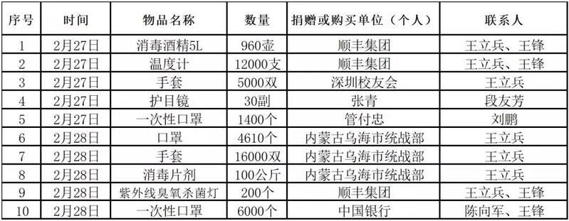 2020年1月26日,黄冈师范学院发布了《黄冈师范学院关于接受抗击新冠肺炎爱心捐赠的通告》,各校友分会、广大校友、在校师生、社会爱心人士情系黄师,纷纷捐款捐物。现将2月26日18点—2月29日18点接受的物资捐赠情况、资金捐赠情况、物资使用情况和捐赠资金使用情况公示如下: