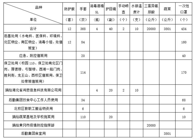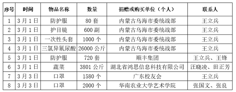 2020年1月26日,黄冈师范学院发布了《黄冈师范学院关于接受抗击新冠肺炎爱心捐赠的通告》,各校友分会、广大校友、在校师生、社会爱心人士情系黄师,纷纷捐款捐物。现将2月29日18点—3月3日18点接受的物资捐赠情况、资金捐赠情况、物资使用情况和捐赠资金使用情况公示如下: