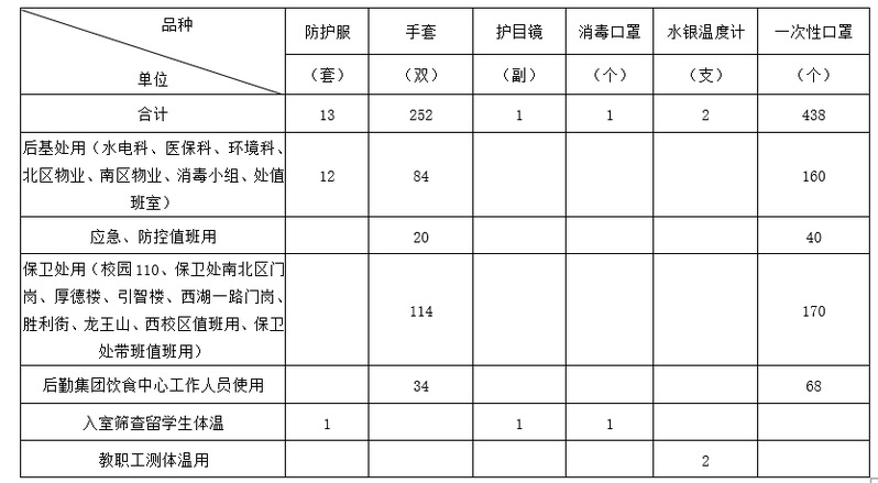 物资类型:主要接受正规渠道生产的N95口罩、外科口罩、一次性医用口罩、消毒水、防护服、护目镜、测温仪等医疗防护物资捐赠。暂不接受与疫情防控无关的物资捐赠。
