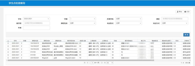 “信息查询”——“学生点名册查询”,将会弹出本学期所有课程列表,如下图: