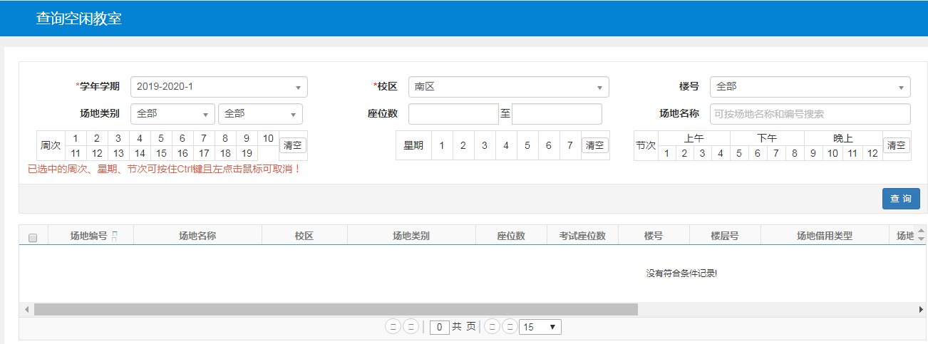 “信息查询”——“查询空闲教室”,可以按照时间或场地查找空闲教室。