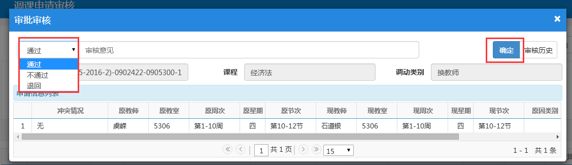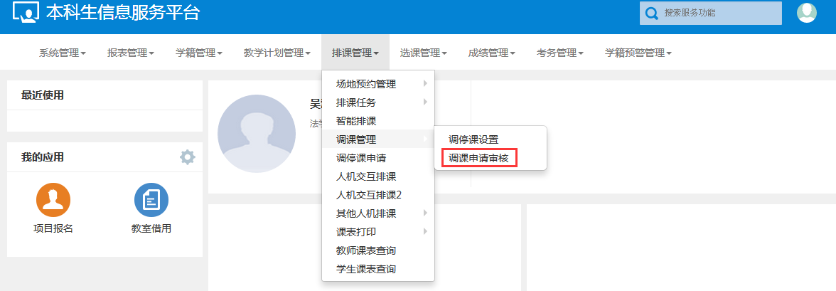 1.登陆界面后选择“排课管理”—— “调课管理”, 先进入“调课申请审核”界面。