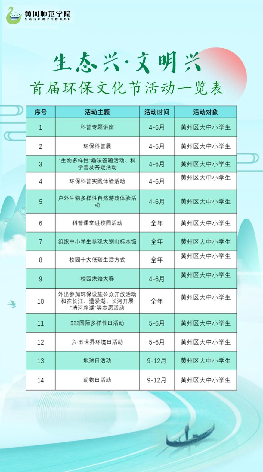 当当! 掐指一算 首届环保文化节它来了哦,有各种各样丰富精彩的活动等待着你的到来。是不是很期待呢?快来查收一份活动预告单吧,看看有没有心动想参与的吧!