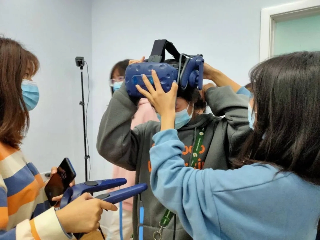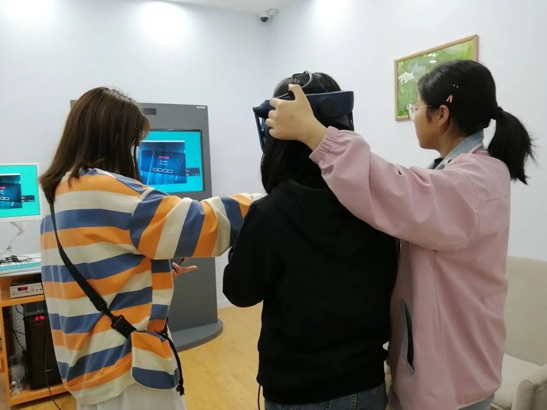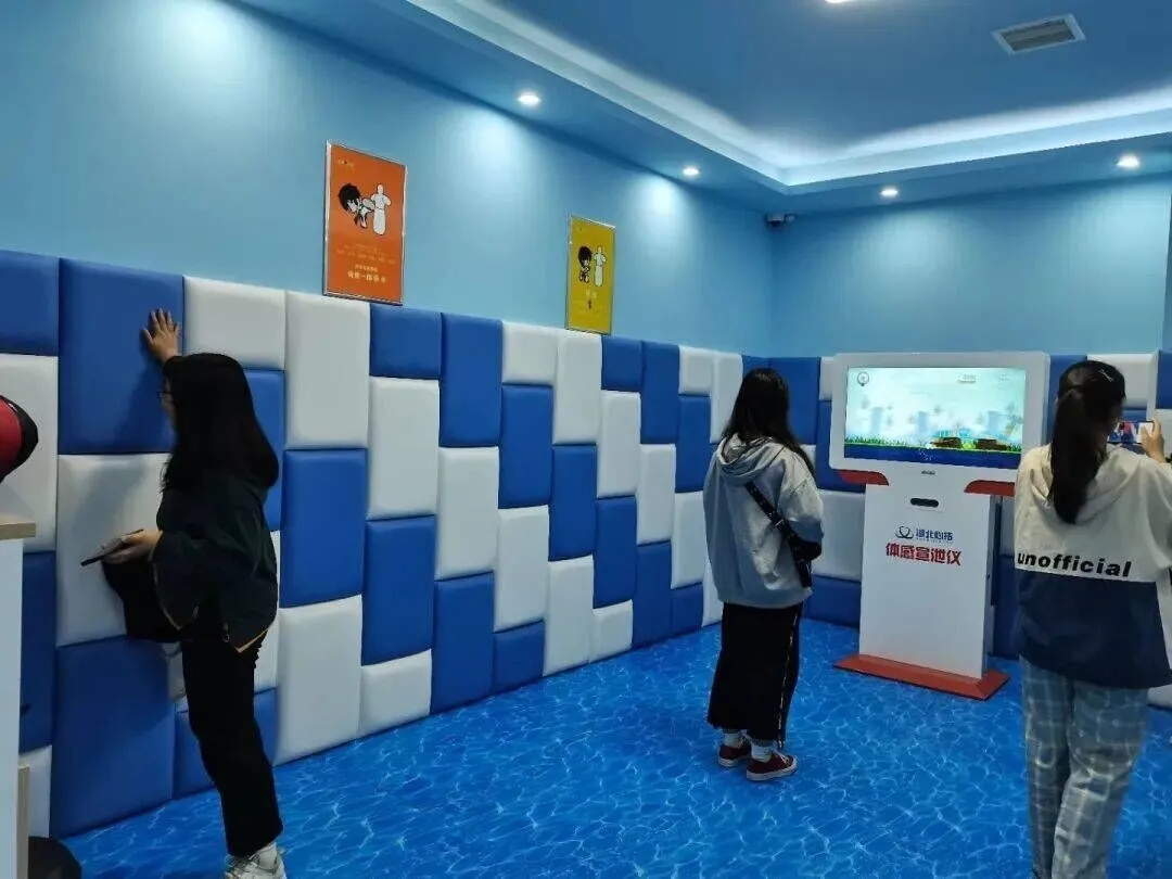 在结营仪式之前,心理委员开展“大学生心理健康教育与咨询中心体验日”活动,在讲解员的引导下,心理委员依次参观团体活动室、宣泄室、中控督导室、沙盘室、音乐放松室、咨询室、家庭咨询室、3D光影体验室等10间功能室,讲解员向大家介绍各功能室的作用并指导使用专业仪器。
