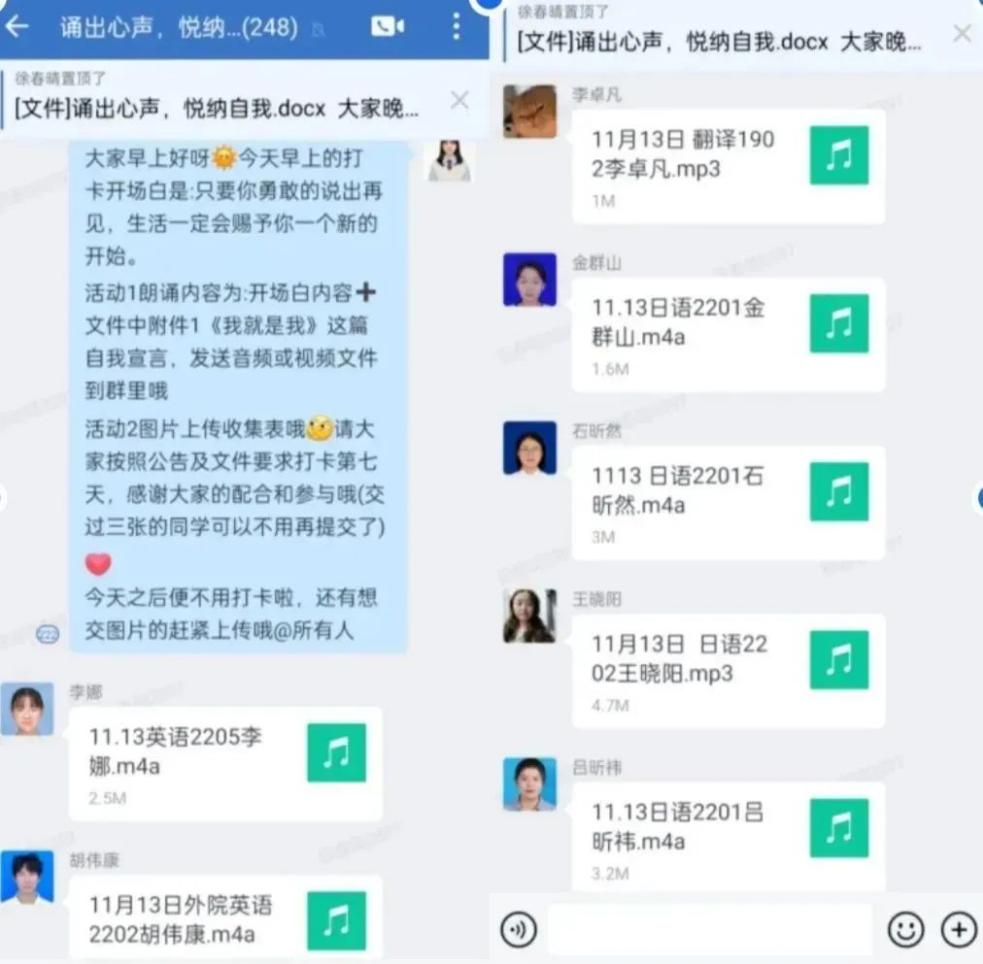 活动期间,约有250人参加,绝大多数同学能每天在活动群内发布自己的朗读音频,这是一步步接纳自我的尝试,更是一次次勇敢与自己内心沟通的体现。与此同时,同学们每天还会分享一些治愈心灵系照片,这些照片容纳着生活中的点点滴滴,在每一处细微的地方,展示出其蕴含着的美好。或许是一缕洒在晚间的皎洁月光,或许是承载一日之始的剔透朝露,或许是亲朋挚友分享的生活点滴,亦或许是自己亲笔写下的心中愿景。它们总是散发着微微光芒,去温暖我们的内心,告诉我们需好好热爱生活。